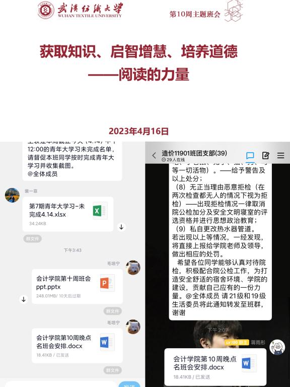 根据学校及学院相关工作安排,4月16日晚,学院全体辅导员、班主任通过线上方式,深入各班级组织召开晚点名,开展“好书伴我行,书香遍校园”主题班会,学院全体本科生、研究生参加班会。