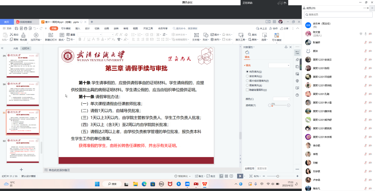 此外,班主任、辅导员还组织同学们观看就业宣传视频,帮助学生解答考研、择业疑惑,并带领同学们学习“五一”长假安全须知、武汉纺织大学本科生考勤及请假管理办法,引导同学们度过平安、健康、快乐的假期。