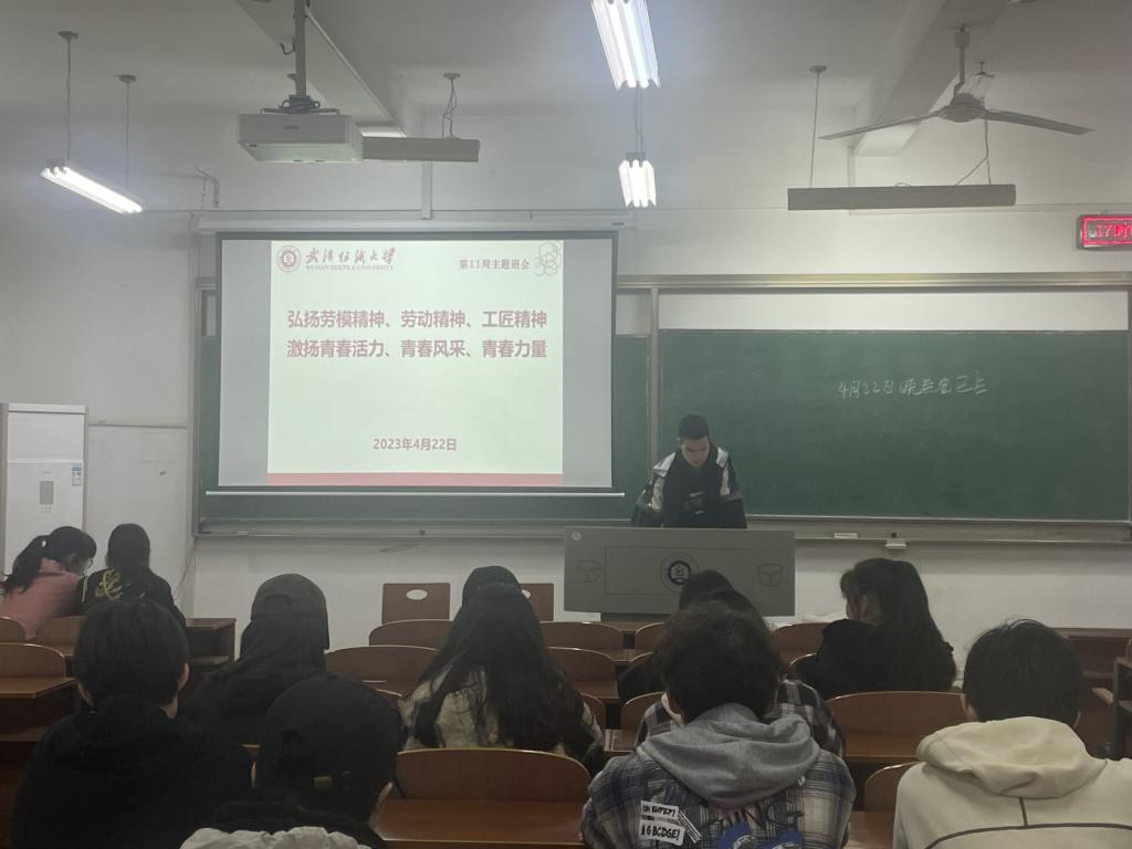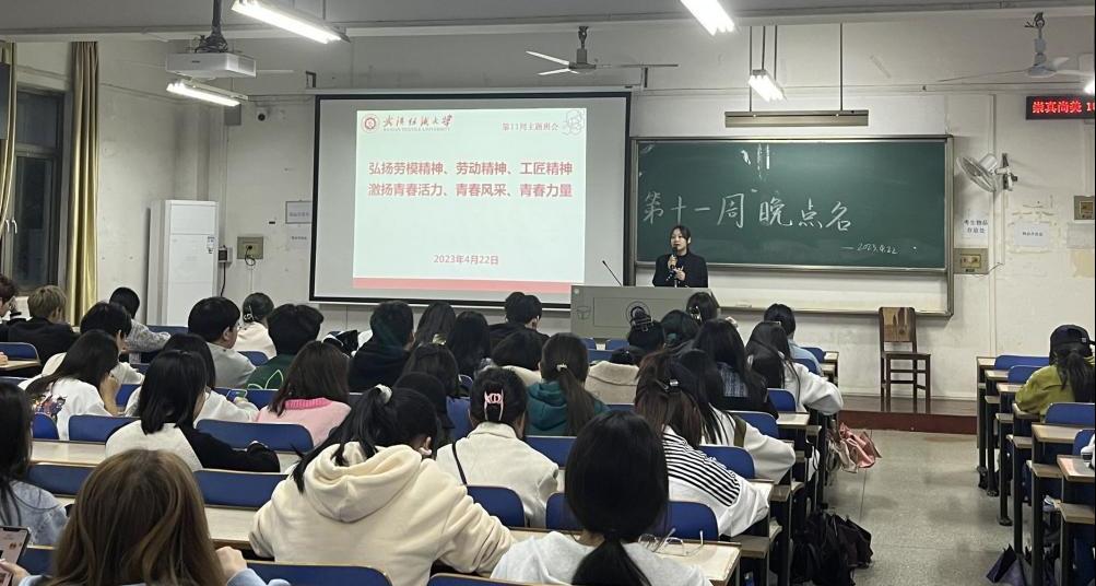 2023年4月22日晚上,武汉纺织大学纺织科学与工程学院进行了本学期第十一周晚点名。本次会议旨在做好五一劳动教育,弘扬劳动精神,同时提醒学生做好假期安排,提高安全意识。会议由学院辅导员及全体学生共同参与。