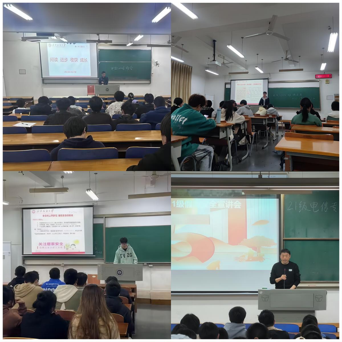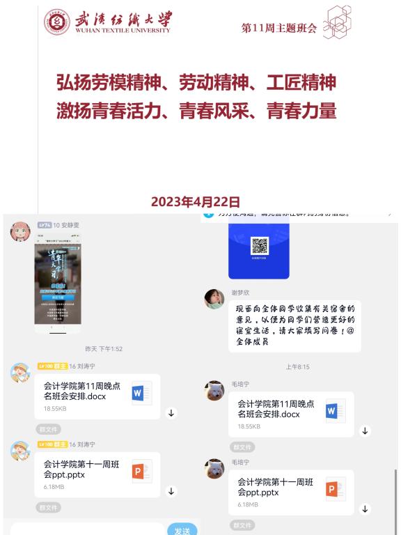此外,全体班主任和辅导员引导同学们在4月23日世界读书日即将到来之际,感受阅读的力量,获取知识、启智增慧、培养道德,得到思想启发,树立崇高理想,涵养浩然之气。为学校的学风建设和安全建设做出自己应有贡献,并带领同学们学习诈骗手段及预防措施,组织同学们观看防范网络电信诈骗视频。除此之外,组织同学们观看就业宣传视频,帮助学生解答考研、择业、就业和创业疑惑,并带领同学们学习五一”小长假安全小贴士,重温武汉纺织大学本科生考勤及请假管理办法。