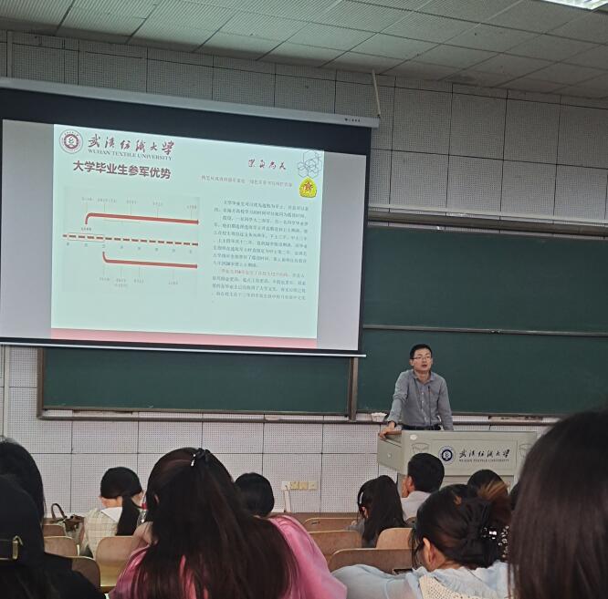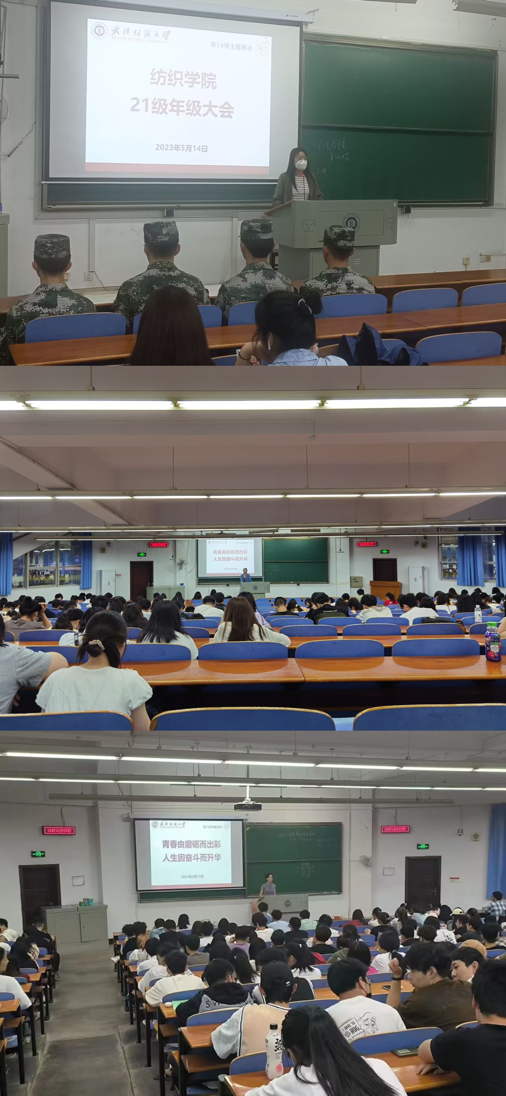 为对学生进行安全教育,重点讲解防灾减灾知识,提升学生风险识别和避灾自救技能,扎实开展大学生征兵入伍宣传工作,纺织学院于5月14日在3号教学楼开展“青春由磨砺而出彩,人生因奋斗而升华”主题班会,本次班会由各年级辅导员、班主任主持,全体学生共同参与。