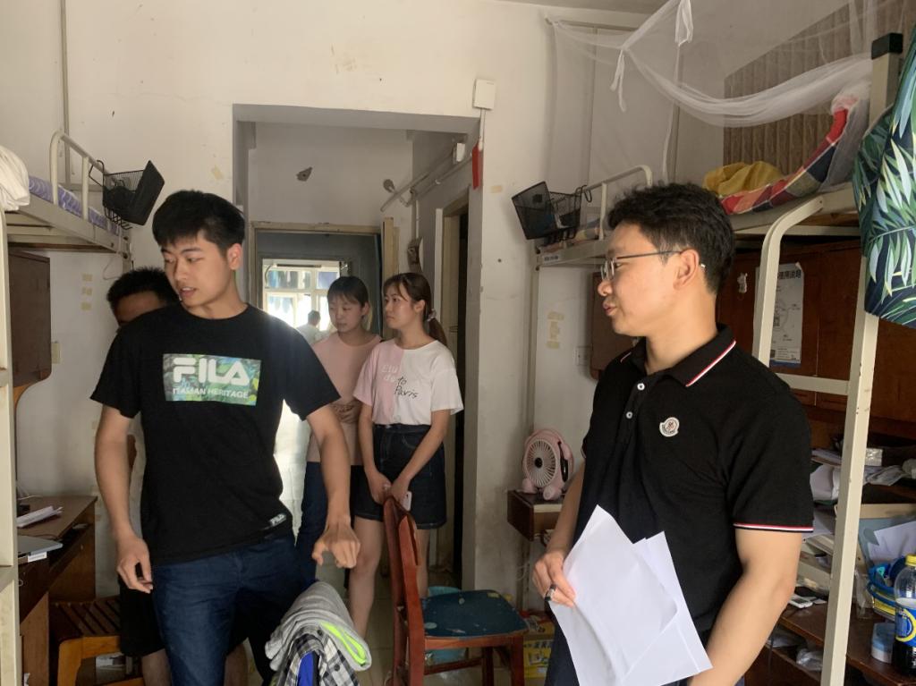 随后,刘书记和全体辅导员分成3个小组深入学生宿舍开展安全大检查。检查组认真查看了学生宿舍封门、安全和卫生情况,并与暑期留校学生进行了交流,了解他们的学习、生活安排。查寝老师提醒学生要牢牢树立宿舍安全意识,要做好疫情防控和防火、防汛、防盗、防诈骗等工作,叮嘱陆续离校的同学们关好门窗,在归家途中小心防范,确保自身安全,到家后及时报一声平安!