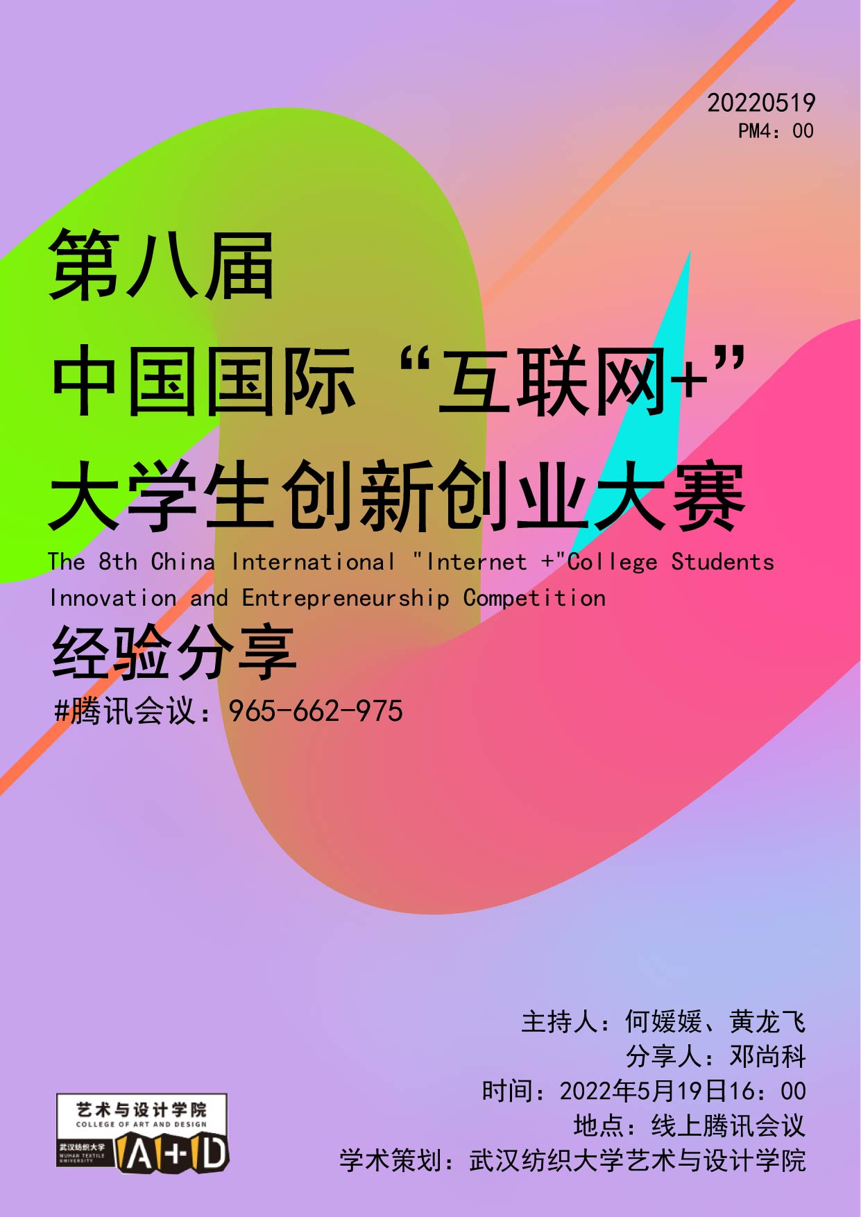 5月19日,艺术与设计学院第八届中国国际“互联网+”大学生创新创业大赛经验分享会顺利举办。此次分享会的分享人是学艺术与设计学院20级研究生邓尚科。通过线上的方式,邓尚科同学从赛事介绍、如何参赛、项目挖掘等各方面分享了自己的经验和感悟。视觉传达系主任黄龙飞,教师何媛媛以及各年级学生八十余人参与了本次分享活动。