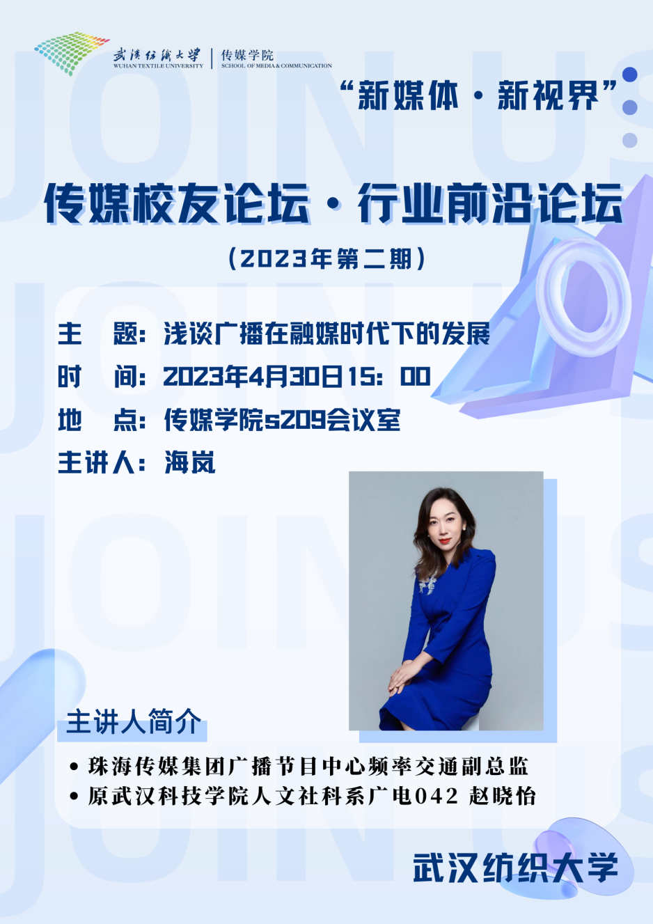 弦歌不辍,薪火相传;栉风沐雨,春华秋实。4月30日,传媒校友·行业前沿论坛(第二期)在传媒学院会议室举行。学院广电042班毕业生、珠海传媒集团广播节目中心交通频率副总监赵晓怡(海岚)校友围绕“浅谈广播在融媒时代的发展”与在场老师、校友以及学弟学妹们分享了珠海广播的发展、活动以及传统广播在融媒时代的出路。