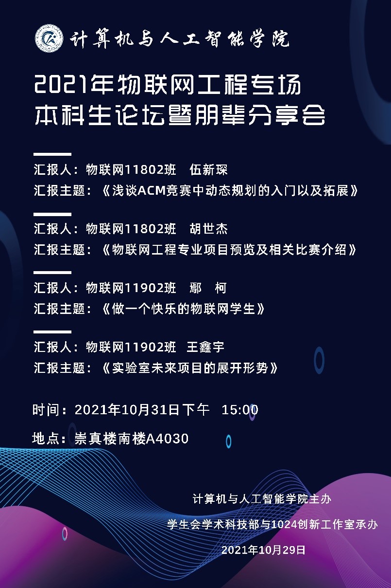 10月31日下午,计算机与人工智能学院2021年物联网工程专场本科生学术论坛暨朋辈分享会在崇真南楼A4030如期举行。本次论坛邀请了物联网专业2018级同学伍新琛、胡世杰和2019级同学鄢柯、王鑫宇分享学术和学科竞赛经验,学院党委副书记涂耀威、副院长魏雄及物联网工程系主任聂刚出席了本次论坛。