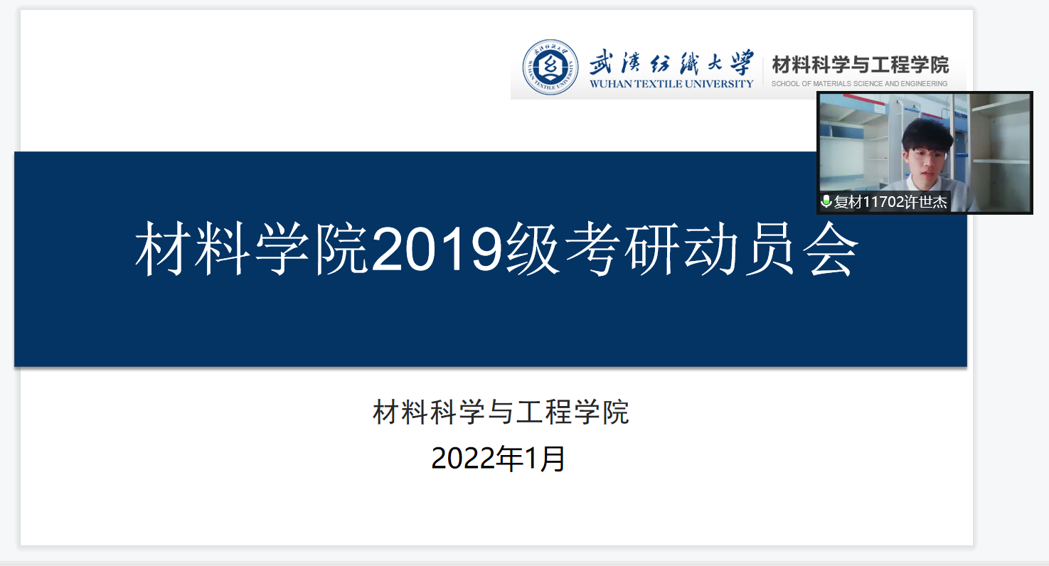 为进一步提高材料学院2019级学生考研报考率、过线率,1月11日下午,在腾讯会议举办了材料学院考研经验分享会。邀请了2021届毕业生许世杰(现天津大学研究生)、2018级姜鑫(2022考研报考武汉理工大学)、王萱(2022年考研报考中国地质大学(武汉))同学来分享考研经验,材料学院副书记侯畅、19级辅导员王鑫以及19级全体学生参加会议。